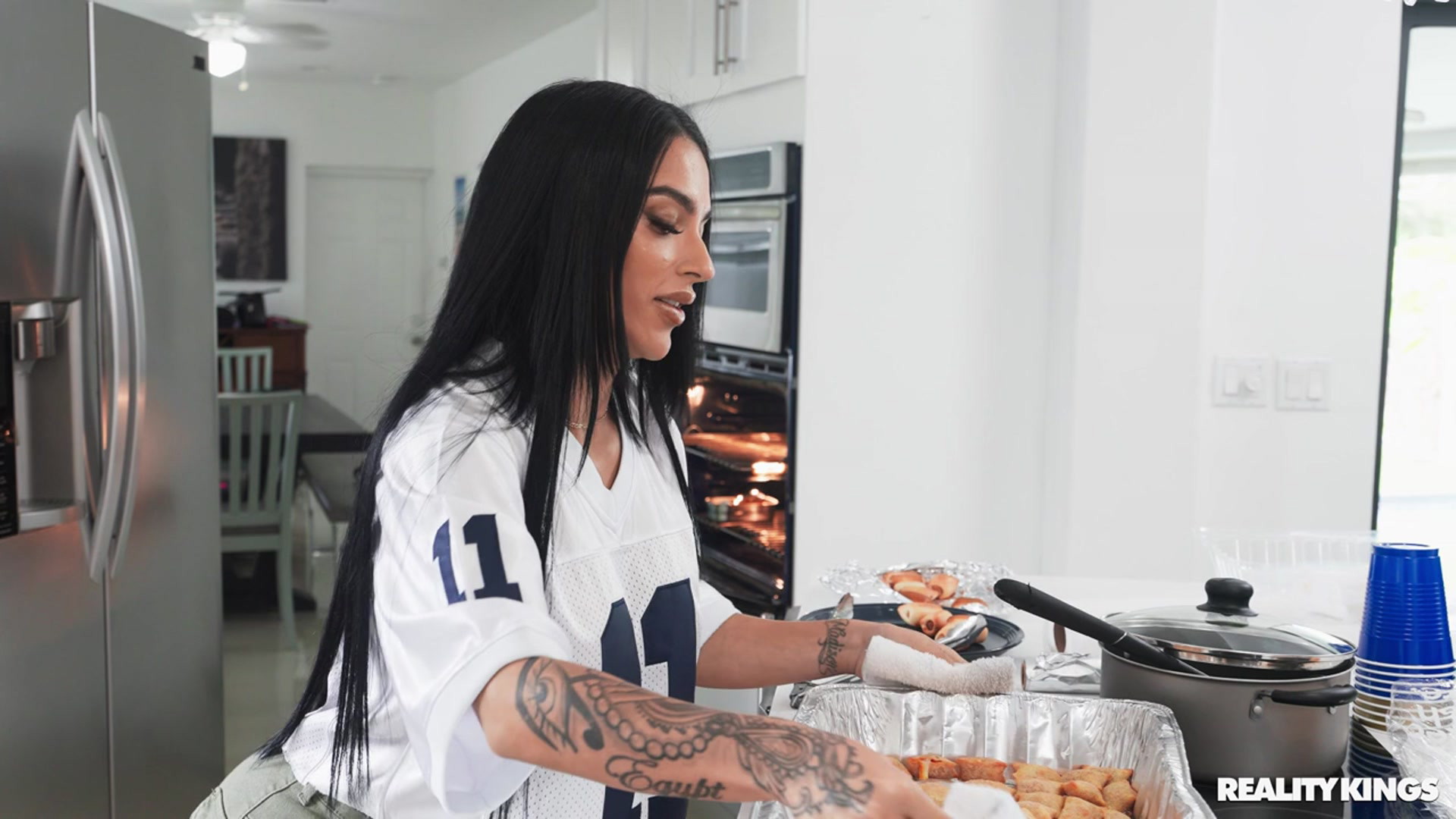by Reality KingsEgypt pours effort into dressing sexy and whipping up heaps of snacks for her boyfriend’s Game Day bash, but he trashes the food and brushes her off the moment his friends show up. She turns her attention to his buddy GI Joey, flashing her massive tits and teasing him by gripping and sliding a baguette between them in a secret titty fuck only he witnesses! Egypt lures Joey to the kitchen, where he dives in to lap at her soaked pussy spread on the counter. She stealthily drops to her knees for a quick blowjob, then bends over to take his cock pounding her cunt from behind while her man chats nearby. As the crew fixates on the game, the lusty duo slips away to the bedroom. Joey rams her pussy hard and deep, pulling out to blast ropes of cum straight onto her heaving tits. Touchdown!